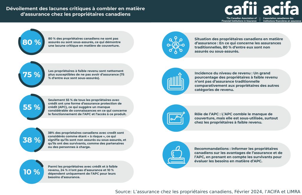 [Toronto, Ontario, 20 mars 2024] Une nouvelle étude menée par la Life Insurance Marketing and Research Association (LIMRA) au nom de l’Association canadienne des institutions financières en assurance (ACIFA) dévoile la situation en matière d’assurance chez les propriétaires canadiens. L’objectif principal de l’étude était de déterminer dans quelle mesure les propriétaires ont des produits d’assurance, en particulier l’assurance protection de crédit (APC). Les résultats ont soulevé des inquiétudes importantes quant à la sécurité financière de nombreuses familles canadiennes.